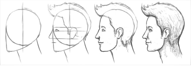 Per quanto concerne il profilo, partendo da un cerchio, tracciate una linea verticale ed aggiungete un' elisse la cui forma ricorda quella di un plettro. In questo esempio, la linea orizzontale tracciata a metà del cerchio definisce il soppraciglio del volto.